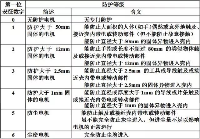 防護標志由字母IP和兩個表示防護等級的表征數字組成。第一位數字表示:防止人體觸及或接近殼內帶電部分和觸及殼內轉動部件(光滑的旋轉軸和類似部件除外),以及防止固體異物進入電機(表示防塵等級)。第二位數字表示:防止由于電機進水而引起的有害影響(表示防水等級)。