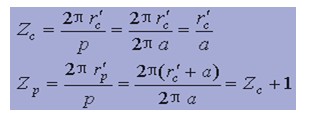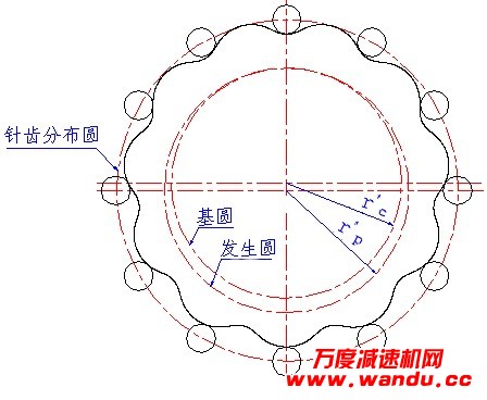Fig.14-2 以理論幾何擺線曲線上的任意點為圓心,以針齒半徑rrp(直徑drp)畫出一系列等圓,由此一系列等圓所包絡出來的內側等距曲線可以作為擺線輪的齒廓。從擺線輪、針齒兩者組成的嚙合關系可知,基園與發生圓的切點始終是傳動節點,而基園是擺線輪的節圓,發生圓是針輪的節圓。 擺線輪節圓上的分齒周節為: p = 2π(rp'-rc') = 2πa; 按分齒周節進行分度,分別得到擺線齒數Zc和針齒數Zp: