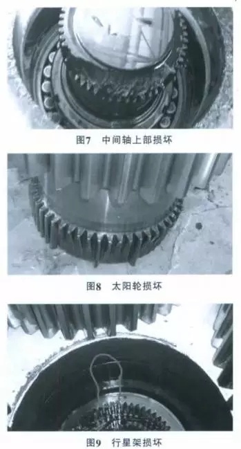 實例 3:內齒套損壞,導致行星架開裂,滑動軸承燒損,中間軸、太陽輪損壞,齒輪軸、中間軸上的軸承更換見圖 6~圖 10。