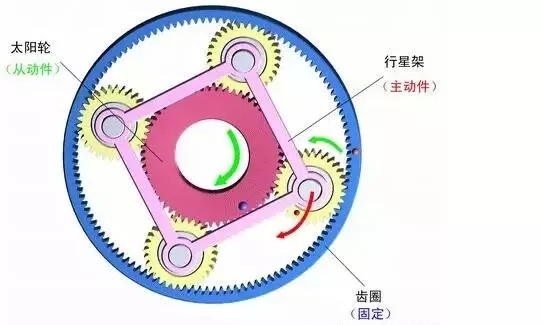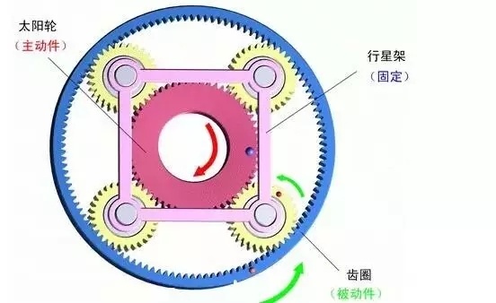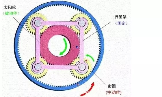 4)太陽(yáng)輪固定,行星架主動(dòng),齒圈被動(dòng)。