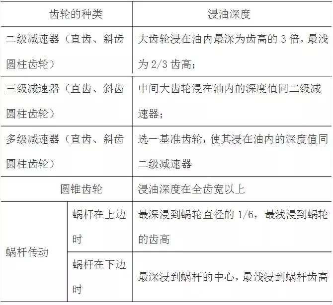 對于采用油裕潤滑的減速機浸油量一般規(guī)定浸過齒輪全齒高的2~3個為宜,當0.5m/s≤V≤3m/s時浸油的深度為浸過齒輪半徑的1/5,對于減速機的浸油量少了有可能造成齒面失油,加速磨損,但也不是越多越好,注油太多,會加大齒輪的攪動力矩,多做功后變成熱而使油溫升高,同時也會造成減速機各處漏油,給設備維護方面帶來很多問題,同時造成設備環(huán)境的污染,所以應按規(guī)定注入一定量的潤滑油,根據(jù)減速機不同種類按照該表參考執(zhí)行: