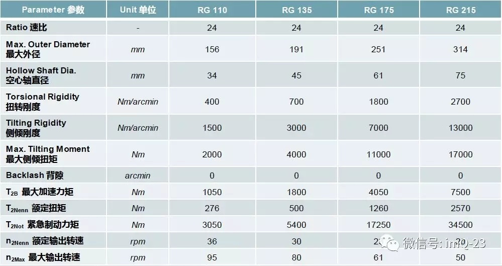 從目前已經(jīng)公布的產(chǎn)品信息看,Galaxie 系列減速機(jī)共有 RG110 ~ RG215 四個(gè)級別的框架尺寸,外徑從 156 ~ 314mm,額定輸出扭矩從 276 ~ 2570Nm,最大扭轉(zhuǎn)剛度可達(dá) 2700 Nm/arcmin。