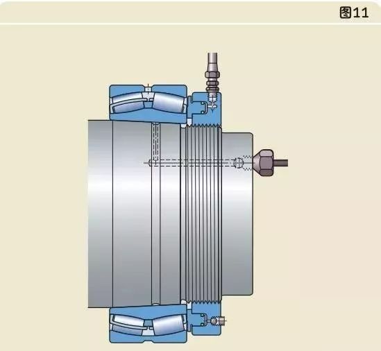 較大軸承需要更大的力來安裝,因此應使用液壓螺母。液壓螺母可以把圓錐孔軸承安裝在圓錐形軸徑上(圖11),緊定套上(圖12),退卸套上(圖13)。