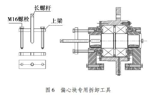 首先充分利用偏心塊側(cè)面上螺紋孔,使用2根M16普通螺栓。拆卸工具上梁采用Q235材料厚度為16mm的鋼板,在中心位置加工成普通M20的螺紋孔,兩側(cè)鉆與偏心塊聯(lián)結(jié)螺栓中心距相配的通孔,另加工一根普通M20的長(zhǎng)螺桿與上梁中心螺紋孔相配合,將各零件裝配成為簡(jiǎn)單的偏心塊拆卸工具。此拆卸專用工具對(duì)材料沒有特殊要求,制造簡(jiǎn)單,使用方便。