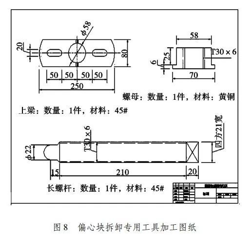 (4)黃銅螺母底部帶6mm的臺(tái)階用于和上梁板裝配時(shí)的定位,和承受拆卸力矩。改進(jìn)后偏心塊拆卸專用工具圖紙如圖7,加工圖如圖8所示。