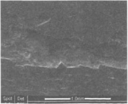 通過對失效齒輪宏觀觀察發現.在嚙合受力齒面的節線附近靠近齒根一側,沿齒寬方向分布許多剝落坑,剝落坑附近有許多點蝕坑,這些點蝕剝落坑再吃款方向上基本連成一線,形成由點蝕剝落?坑組成的凹坑帶,基本與齒寬同長(圖1)。經掃描電鏡觀察,失效齒輪的點蝕剝落坑帶上有較多面積在2mmz以上剝落坑,剝落坑最大深度為0.8mm,剝落坑底部有較淺的疲勞輝紋,底部大致與表面平行(圖2)。剝落坑側面一側大致與表面成45°角,另一側約垂直于表面,剝落部分一端與齒輪基體分離,形成懸臂梁(圖3)。通過對齒輪磨損面的分析,發現失效齒輪具有典型的接觸疲勞特征,?而且齒輪節線附近偏向齒根一側的接觸疲勞較為嚴重。