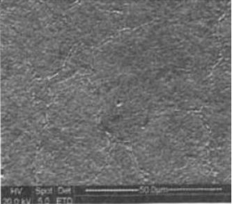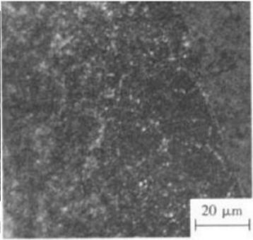 從失效齒輪輪齒部位取樣拋光.經4%的硝酸酒精溶液腐蝕后,在Olympus金相顯微鏡下進行觀察。試樣心部組織為低碳板條回火馬氏體及少量鐵素體(圖4)。滲碳層組織為高碳針狀回火馬氏體及少量殘余奧氏體,馬氏體針葉略微粗大(圖5)。按照JB/T6141.3—1992《重載齒輪滲碳金相檢驗》標準評定,試樣心部組織為2~3級,滲碳層馬氏體組織為4級,符合要求。但試樣滲碳層中有?較細的白色網狀碳化物析出(圖6),按照JB/T6141.3—1992《重載齒輪滲碳金相檢驗》標準評定,試樣滲碳層碳化物為4.5級,不符合標準規定要求。經掃描電鏡觀察,白色網狀碳化物在滲碳層表面附近呈現連續網狀(圖7)。至距表面1?mm處,白色網狀碳化物基本消失(圖8)。較細的白色網狀碳化物是齒輪在滲碳過程中由于冷卻速度較慢,奧氏體沿晶界析出細網狀二次滲碳體。這種白色網狀碳化物會削弱晶粒之間的結合強度,降低齒輪的抗接觸疲勞性能。